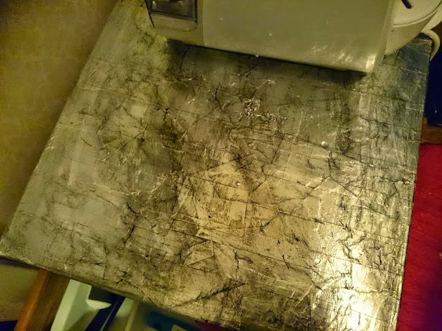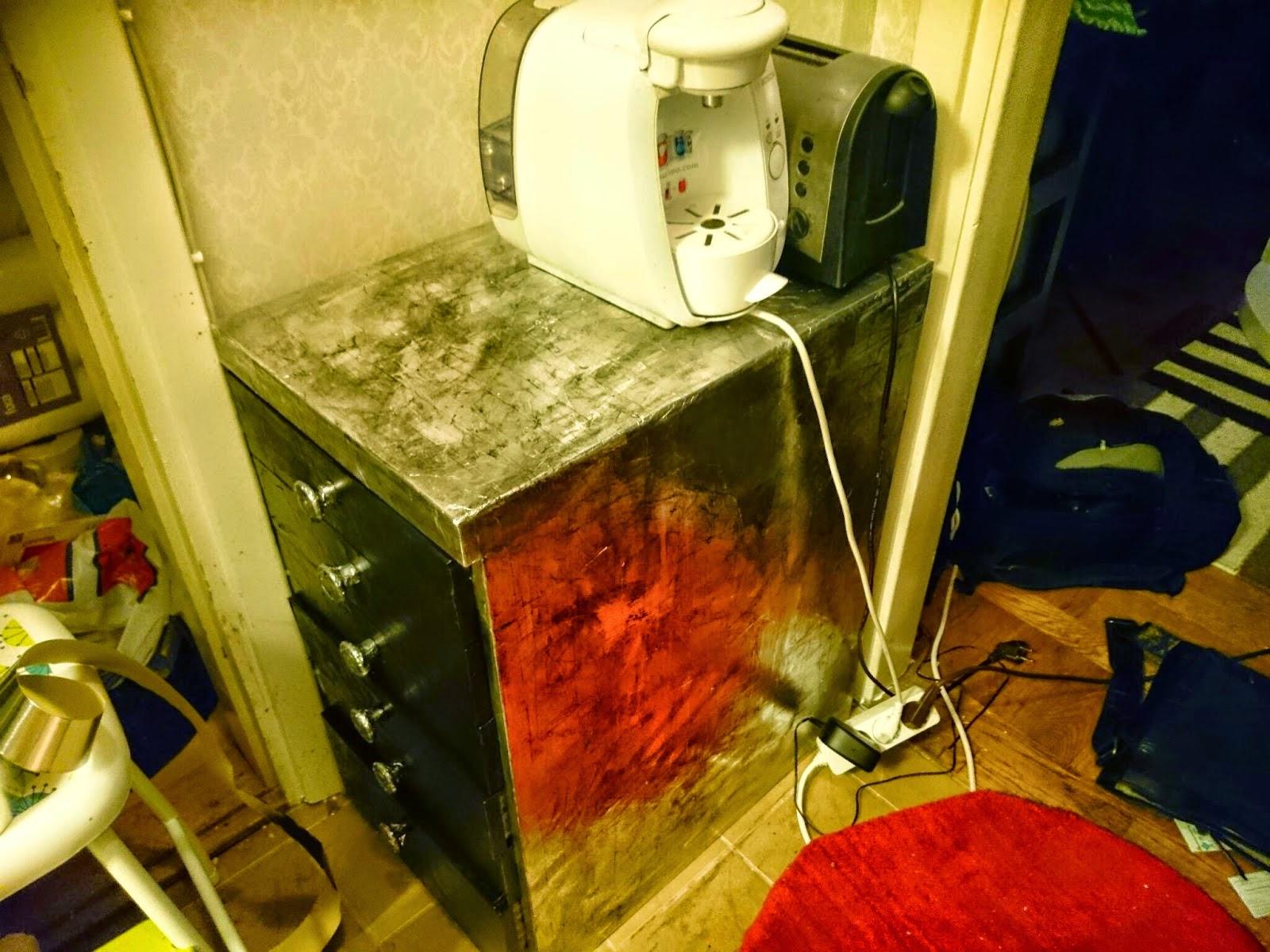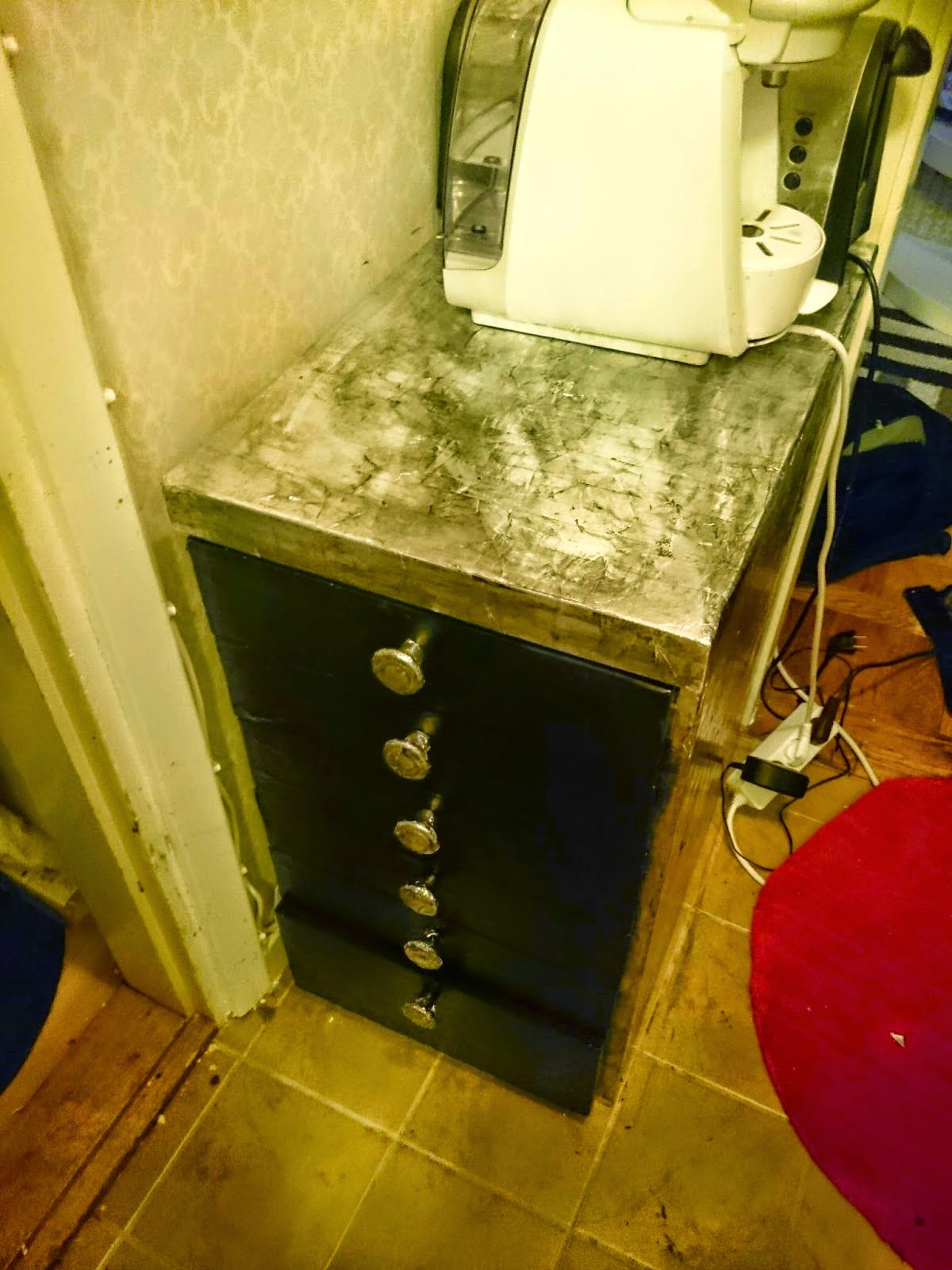 Jag föll för aluminiumtejpen som alla andra så jag gick loss med en rulle. Så med Hjälp av aluminiumtejp, svart akrylfärg jag hade stående i ett skåp, och en sked har jag ju fått en ny snygg möbel till mitt mini kök. Jag har ingen före före bild, alltså på original skåpen men så här såg de ut i morse: